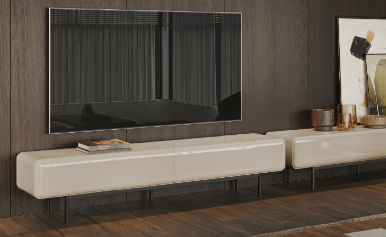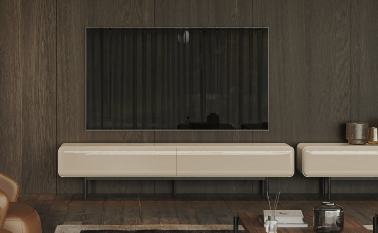 O traço curvo da Base TV Rocco introduz suavidade ao design, quebrando a rigidez das linhas tradicionais. Um detalhe fluido que reforça a identidade da peça e cria harmonia no espaço.