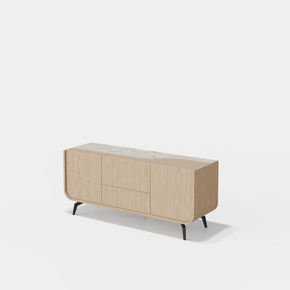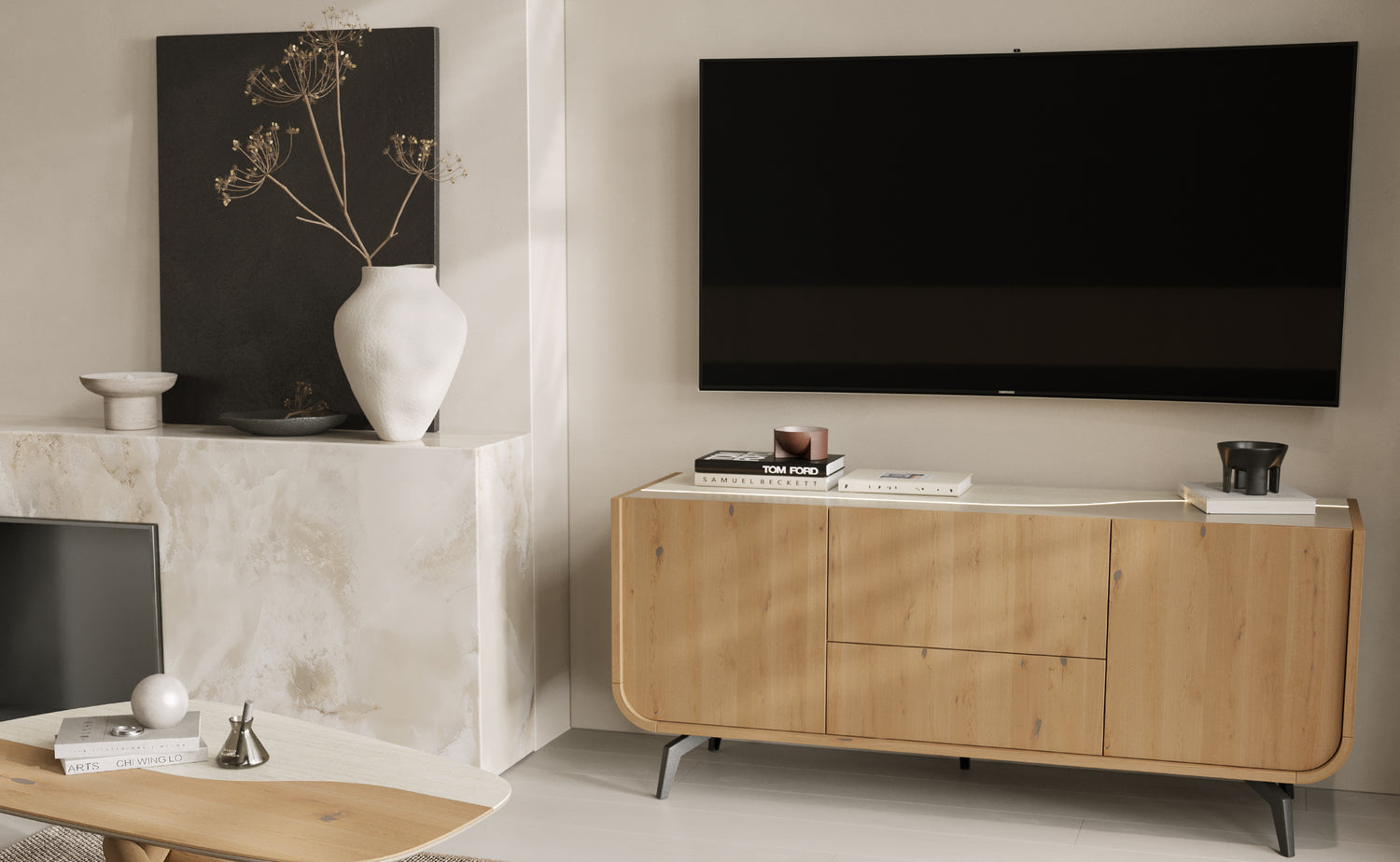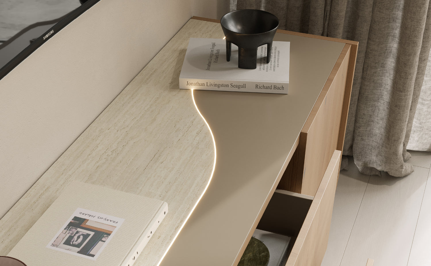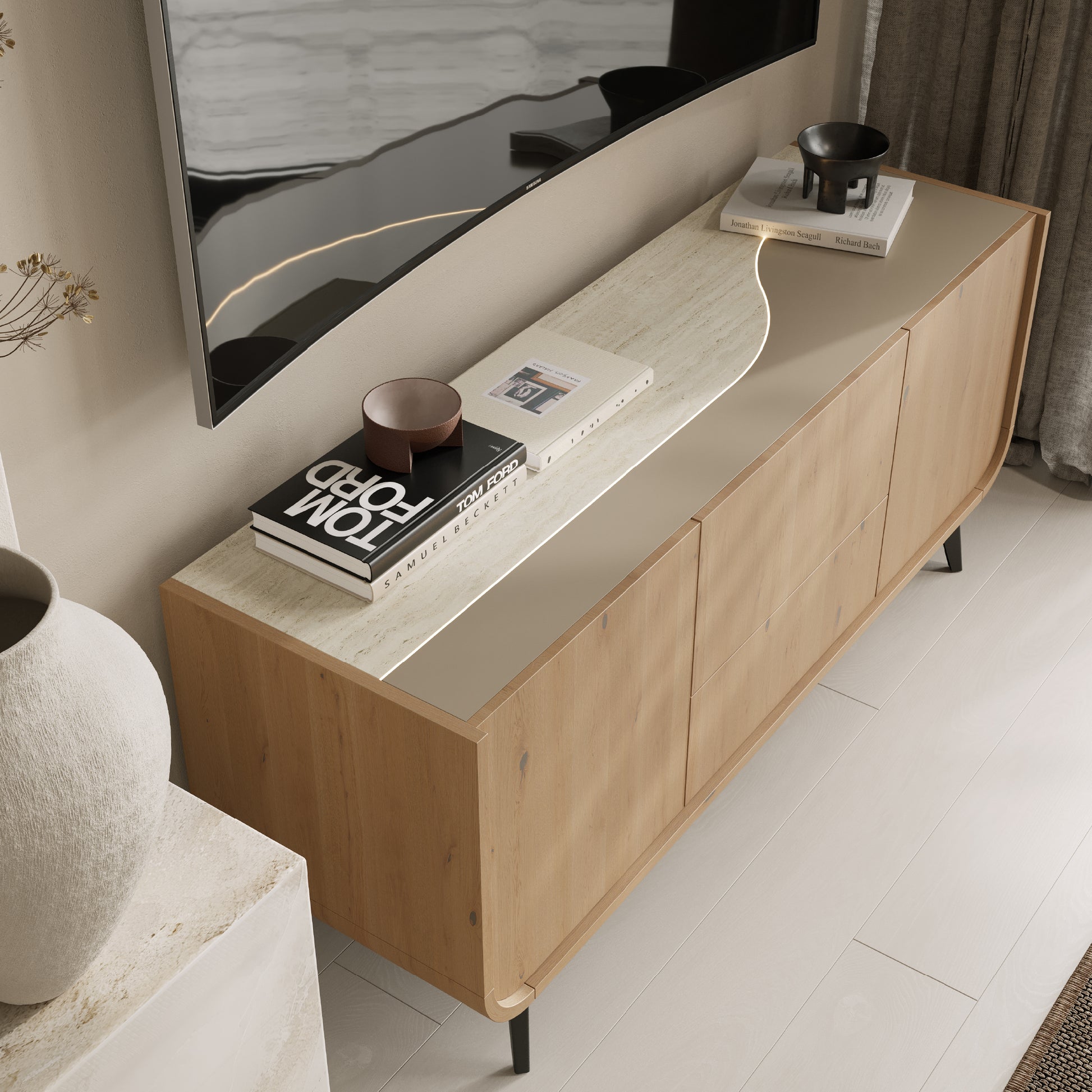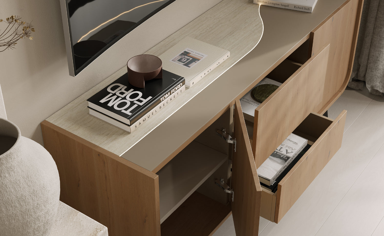 Com duas portas e duas gavetas, a base oferece arrumação prática e organizada para equipamentos multimédia, têxteis ou acessórios, garantindo um ambiente estruturado e elegante. Uma configuração versátil que une utilidade e sofisticação.