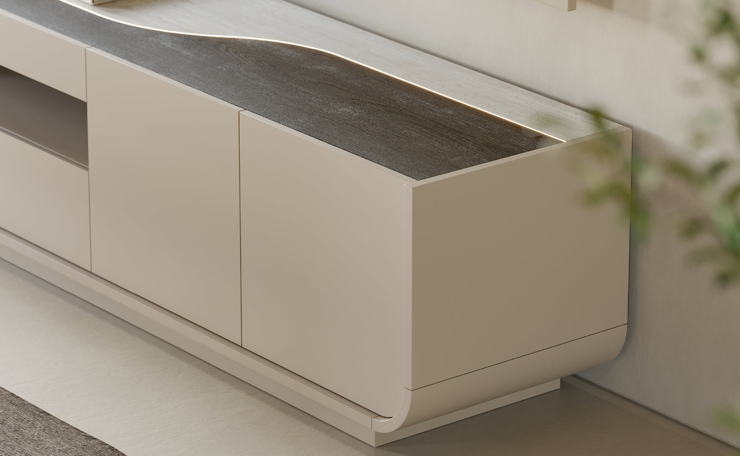 A Base TV Raggi V com Rodapé e Iluminação oferece um design contínuo que se integra perfeitamente na sua sala de estar. Este móvel é ideal para quem procura uma solução que una estética e funcionalidade, criando um ambiente sofisticado e acolhedor. A sua presença transforma a divisão, tornando-a mais convidativa.