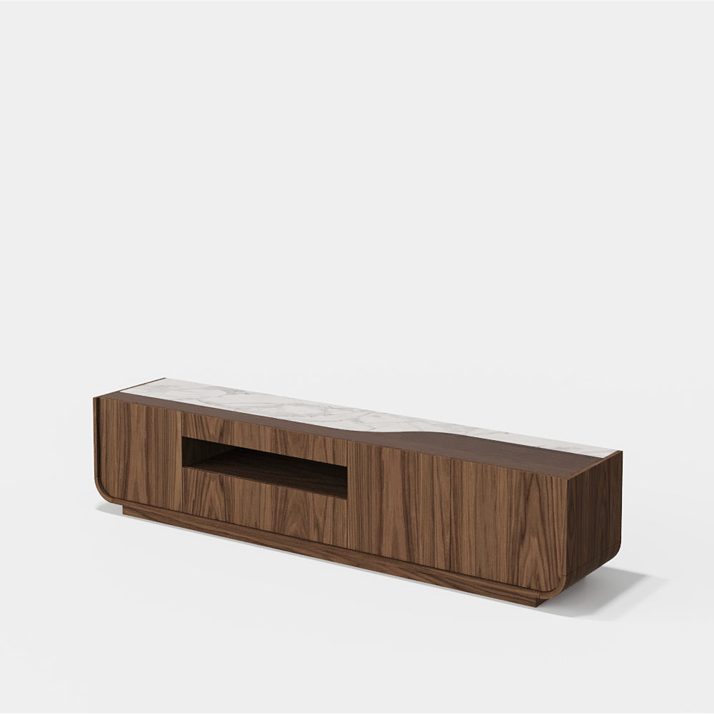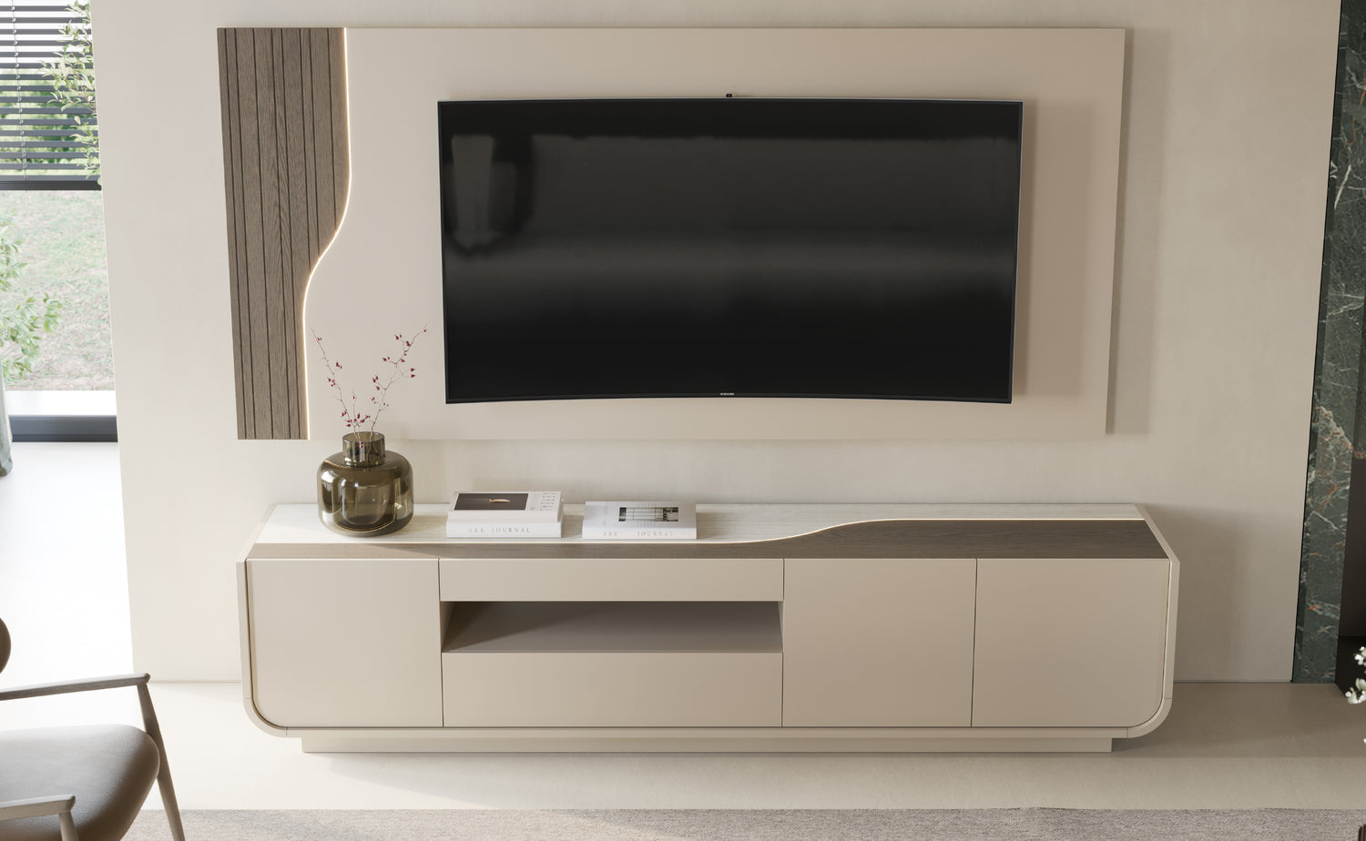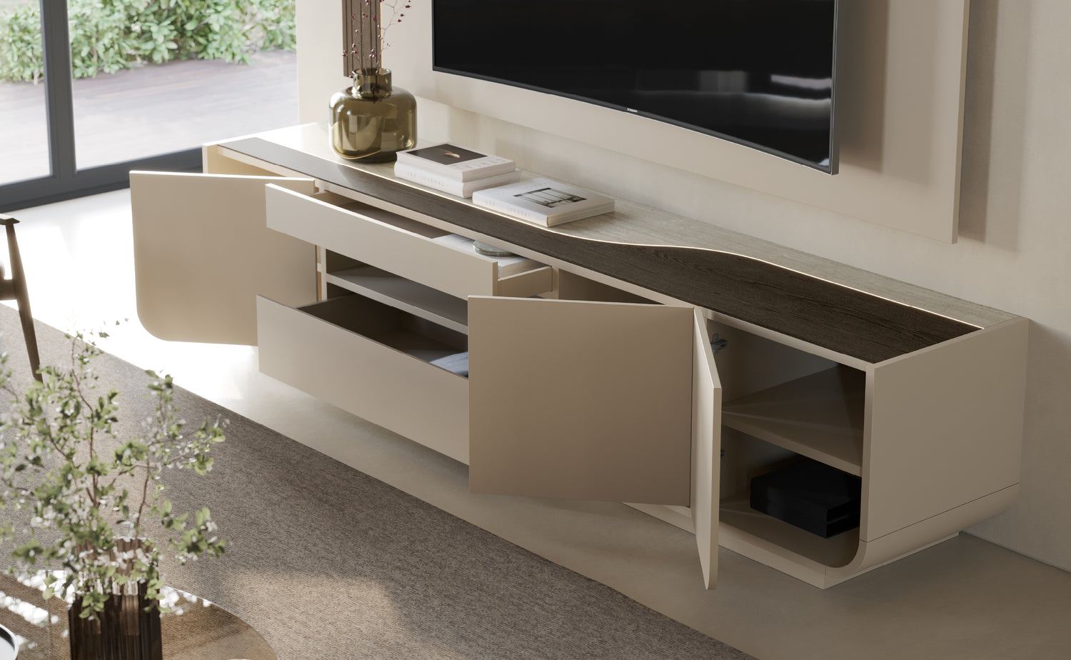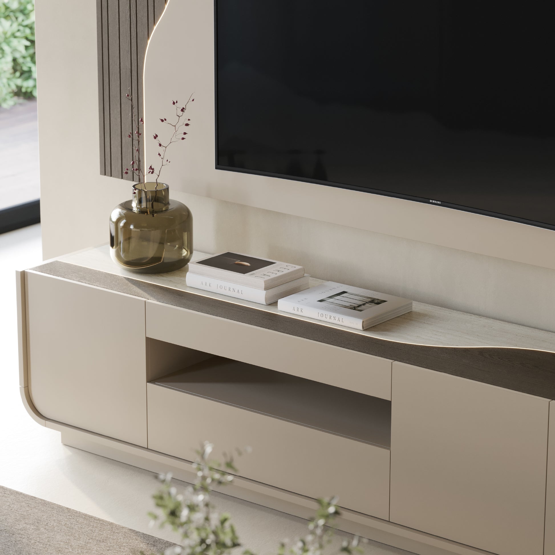 Com três portas, uma gaveta e um nicho aberto, esta base TV oferece arrumação versátil para equipamentos multimédia, acessórios e elementos decorativos. A sua configuração garante organização prática e estética distinta.