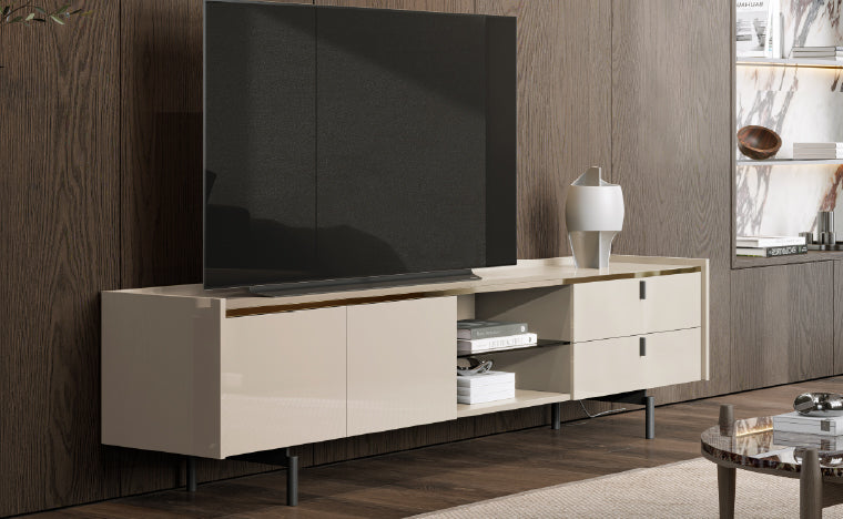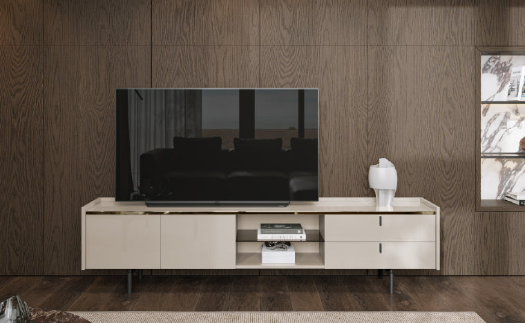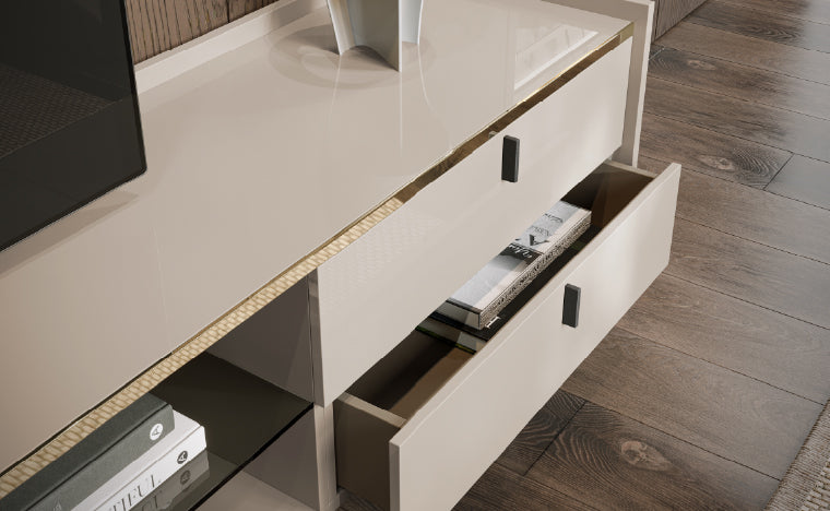 O acabamento lacado da Base TV Senza é realçado por um discreto detalhe em metal. Esta combinação confere sofisticação ao móvel e destaca a sua presença num ambiente contemporâneo.
