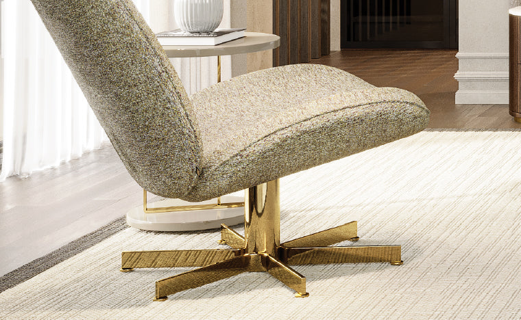 O pé em metal do Cadeirão Ellender assegura estabilidade e durabilidade, reforçando a confiança na peça. Um detalhe estrutural que complementa o design com segurança e subtileza.