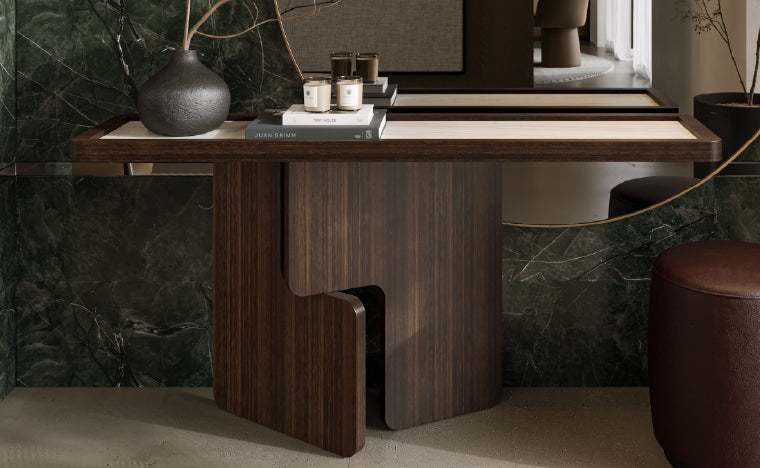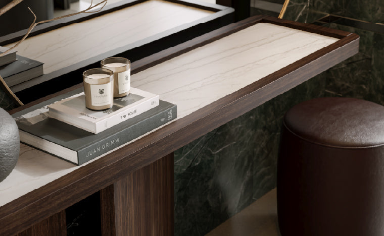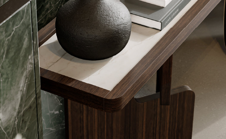 A Consola Colline combina inserções de mármore claro com laterais em madeira escura, criando um tampo que realça veios naturais e contraste subtil. Esta fusão de superfícies valoriza a decoração do hall de entrada, oferecendo um apoio requintado para objectos e pequenos gestos do quotidiano.