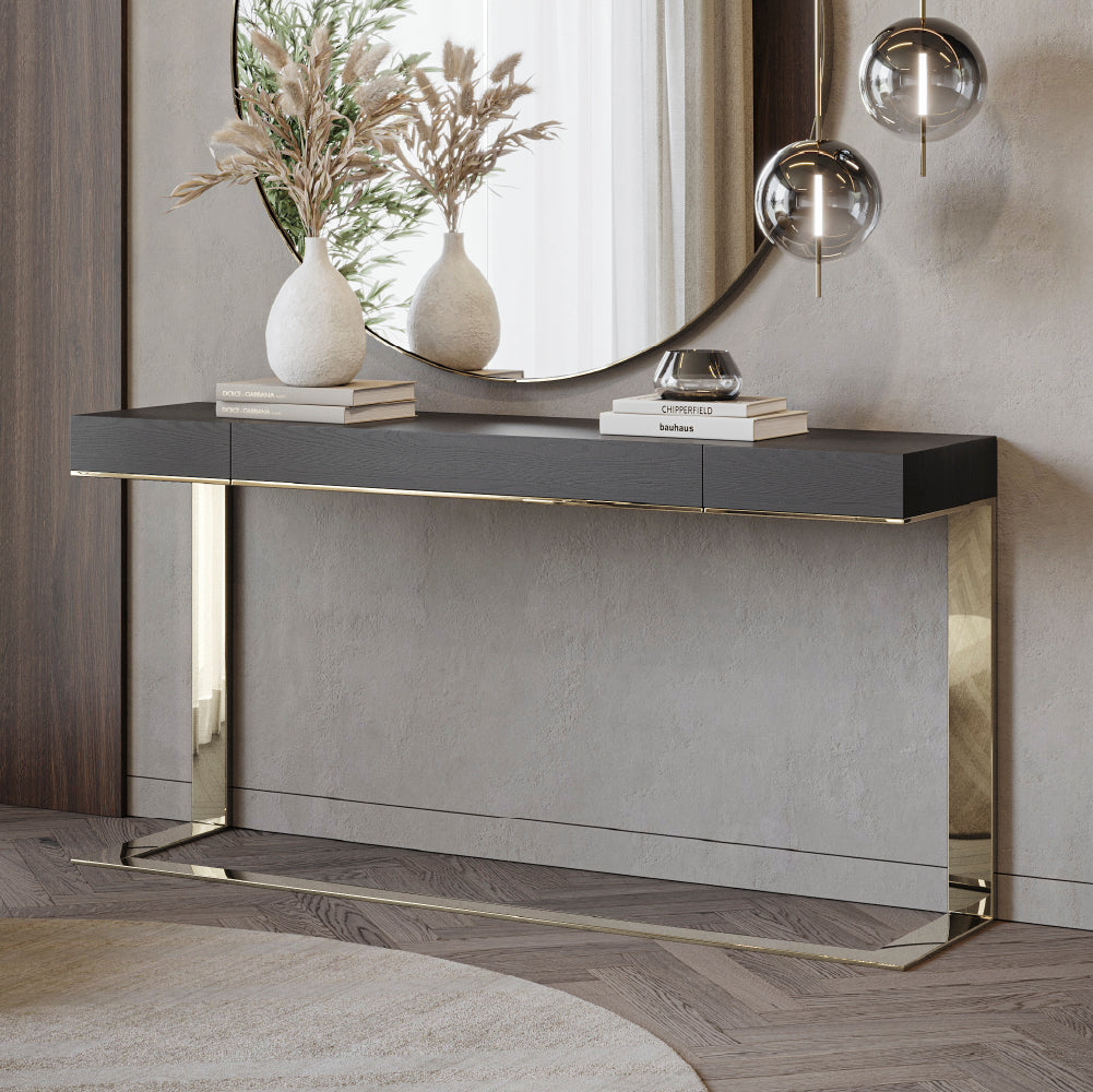 O design da Consola Trace destaca-se pelas linhas esguias e pelos pés metálicos espelhados que refletem a luz, criando uma sensação de leveza visual. Ideal para entradas contemporâneas onde a estética minimalista se encontra com o luxo discreto.