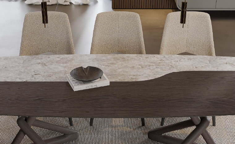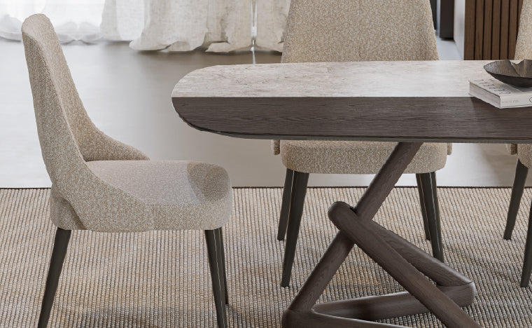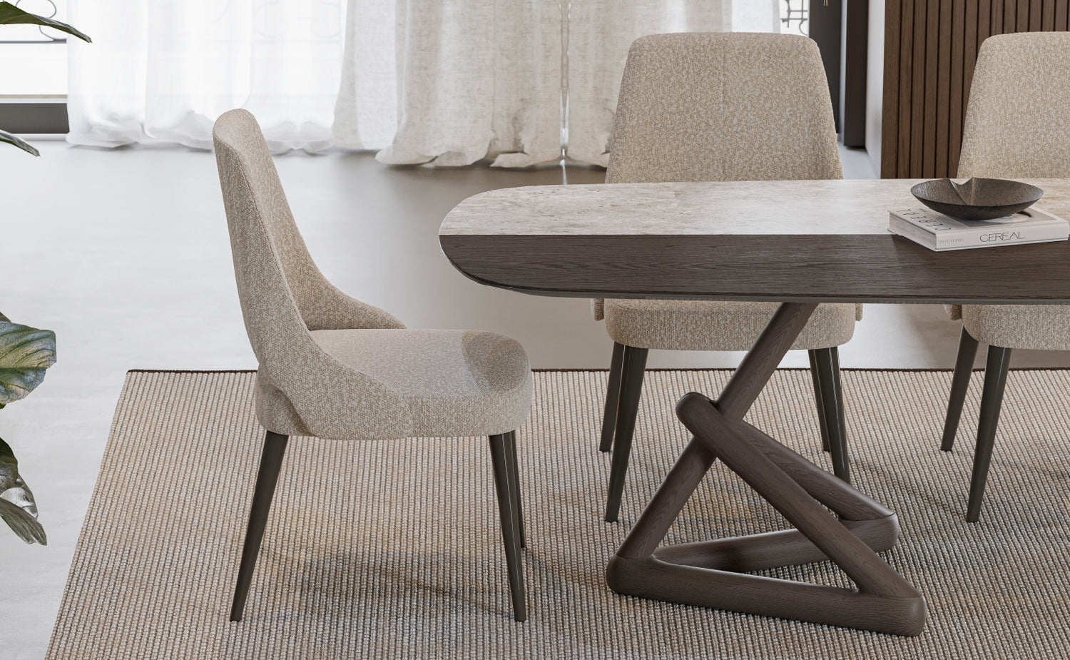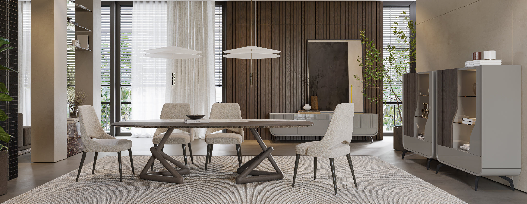 As linhas curvas definem a estética da Mesa Raggi, criando fluidez e um visual distinto. O design foi pensado para conjugar leveza visual com imponência, tornando a mesa num ponto de encontro privilegiado para jantares e momentos de convívio.