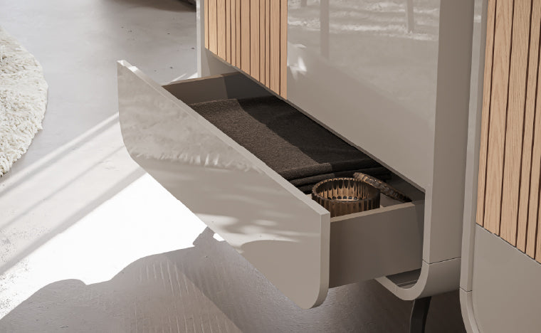 O desenho curvo acrescenta suavidade e movimento subtil, reforçando a contemporaneidade da peça. Este detalhe de design valoriza a estrutura e adapta-se a diferentes estilos de decoração.