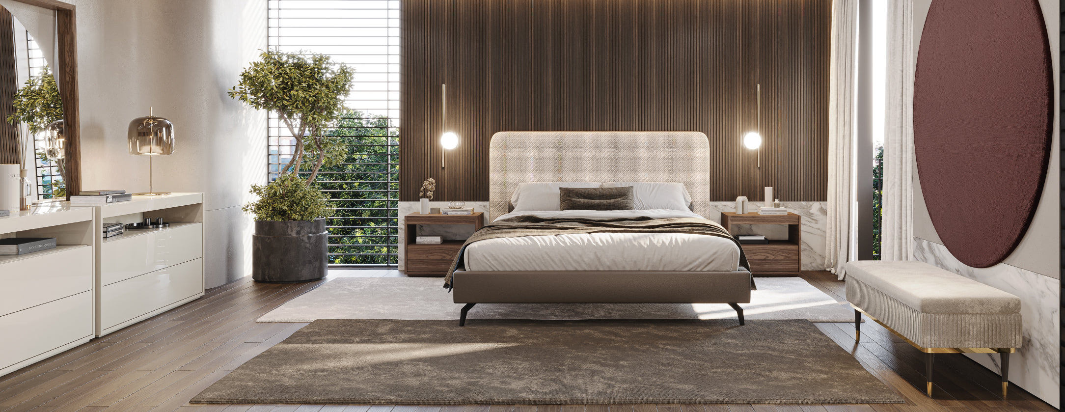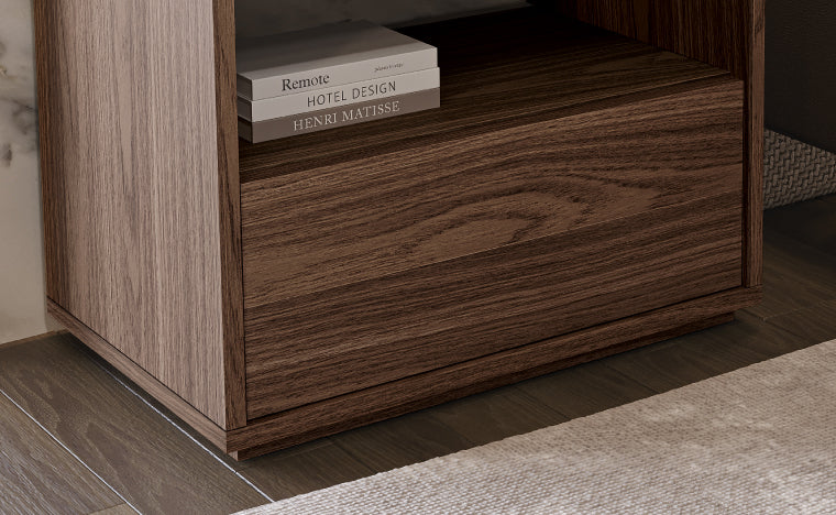 Disponível em diversos acabamentos de madeira, a Hilay adapta-se ao carácter de cada espaço. As gavetas sem puxadores visíveis reforçam a continuidade do desenho, evidenciando a textura horizontal com discrição e elegância.