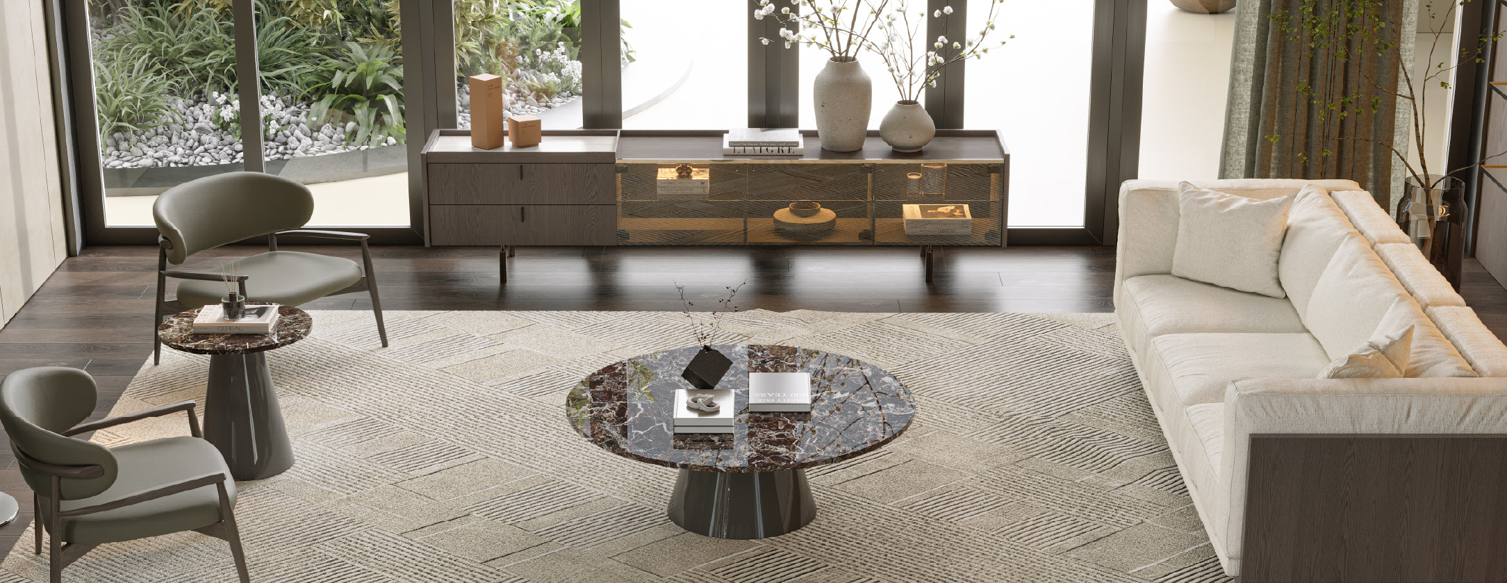 Na Base TV Colline, os materiais encontram-se de forma fluida e equilibrada. Esta combinação cria um visual coeso e sofisticado, que se integra naturalmente em ambientes contemporâneos da sala de estar.