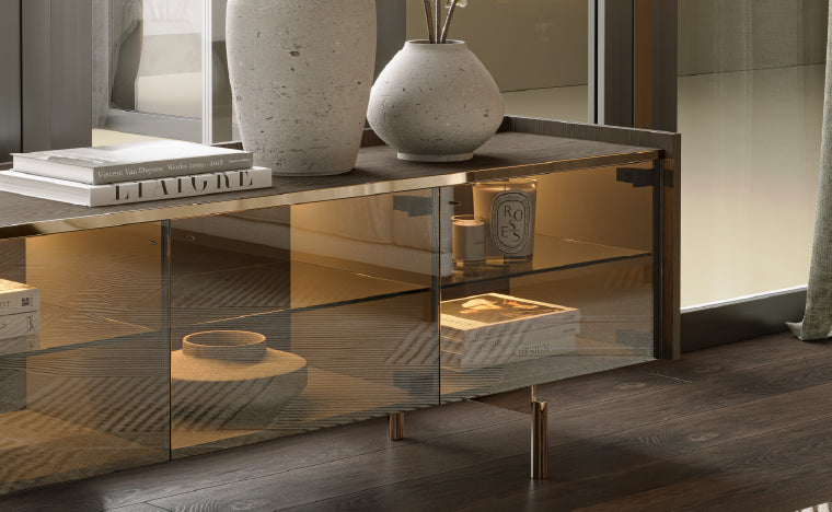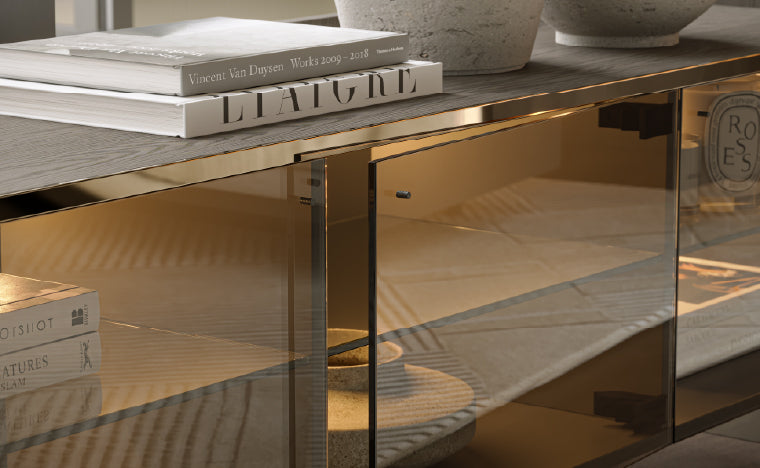 A luz interior acrescenta uma dimensão extra à Base TV Colline. Um recurso funcional e decorativo que valoriza o conteúdo e reforça a atmosfera envolvente da sala de estar, mesmo ao final do dia.