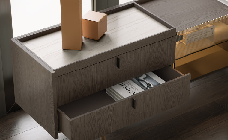 O vidro confere uma sensação de leveza e amplitude, enquanto a madeira aquece e traz textura ao espaço. Esta base integra-se facilmente em diferentes estilos decorativos, proporcionando organização e requinte.