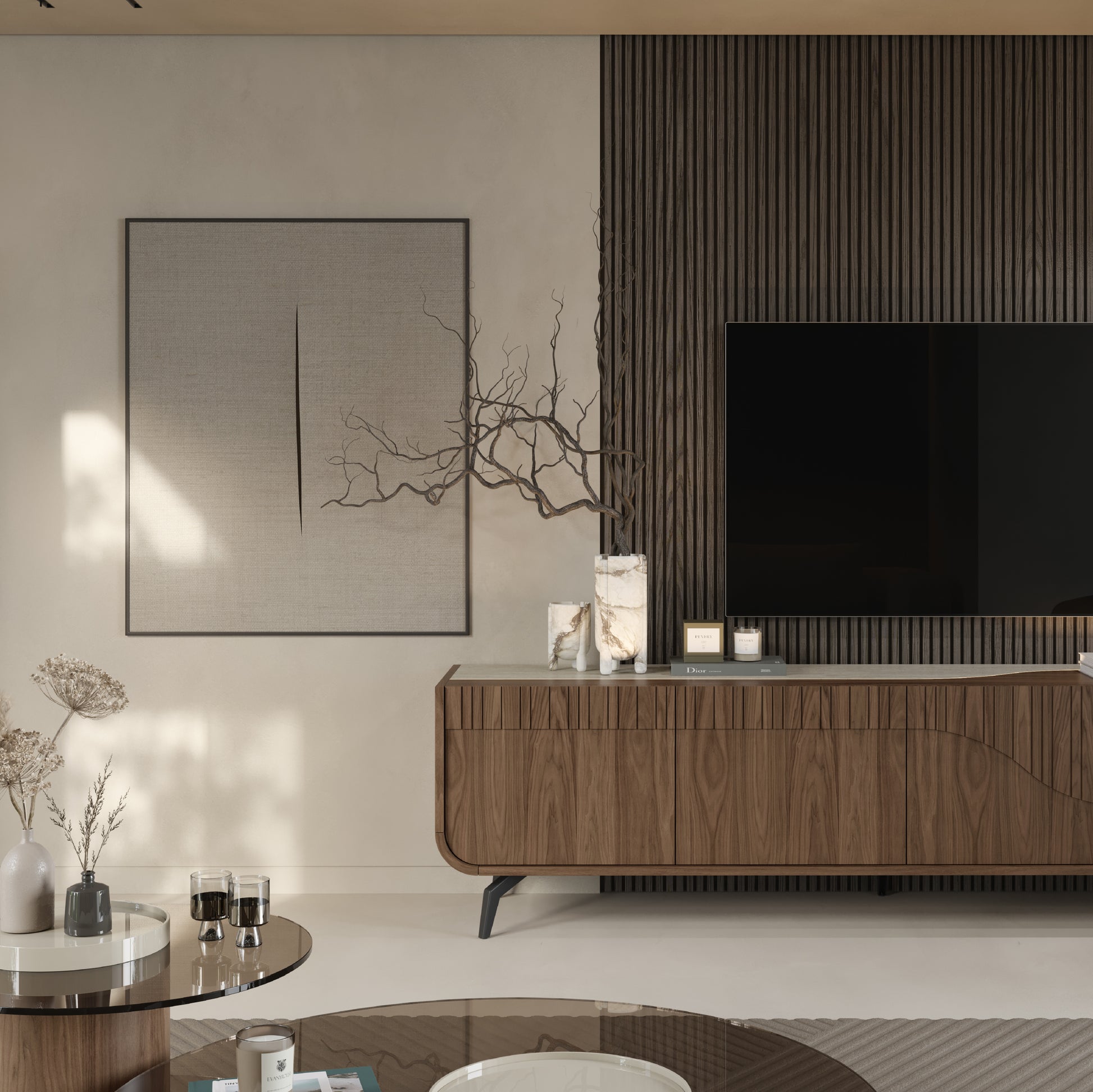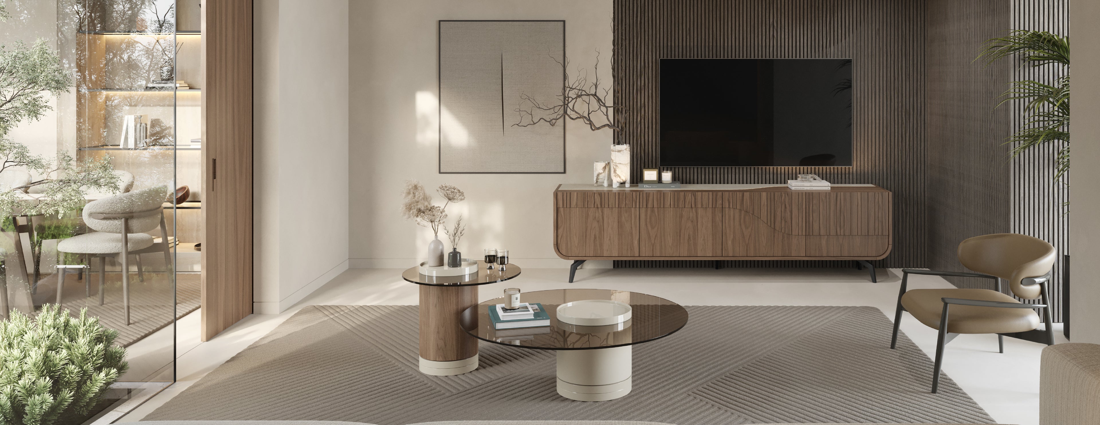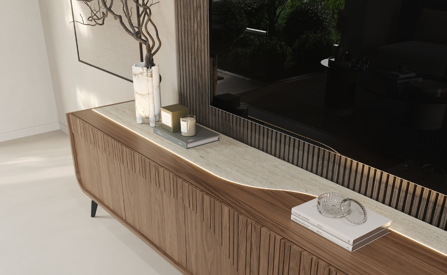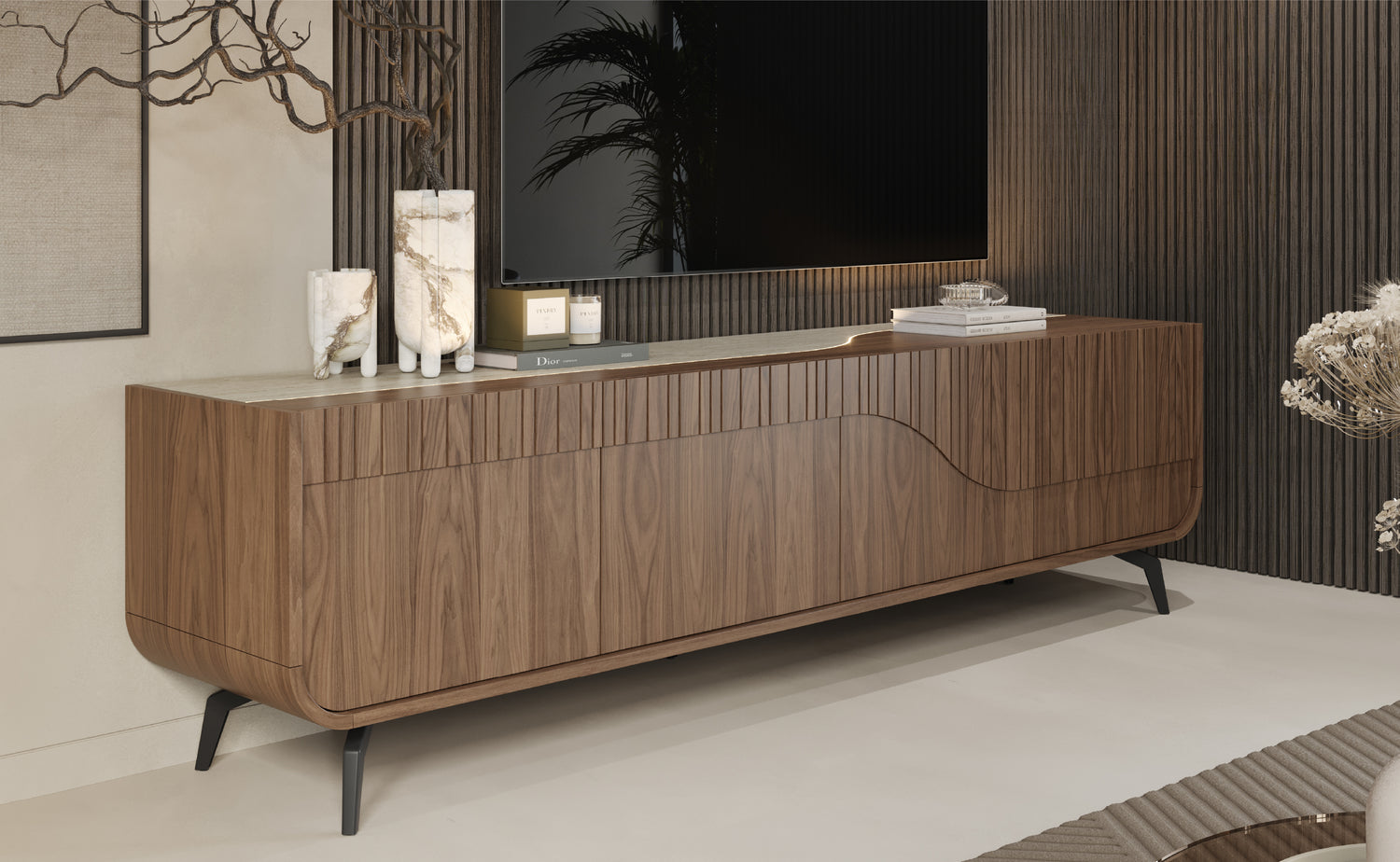 As linhas curvas suavizam a estrutura e criam fluidez visual, acrescentando modernidade à peça. O contraste com os pés em Epoxi Grey reforça o carácter contemporâneo e exclusivo, tornando a base TV num destaque decorativo.