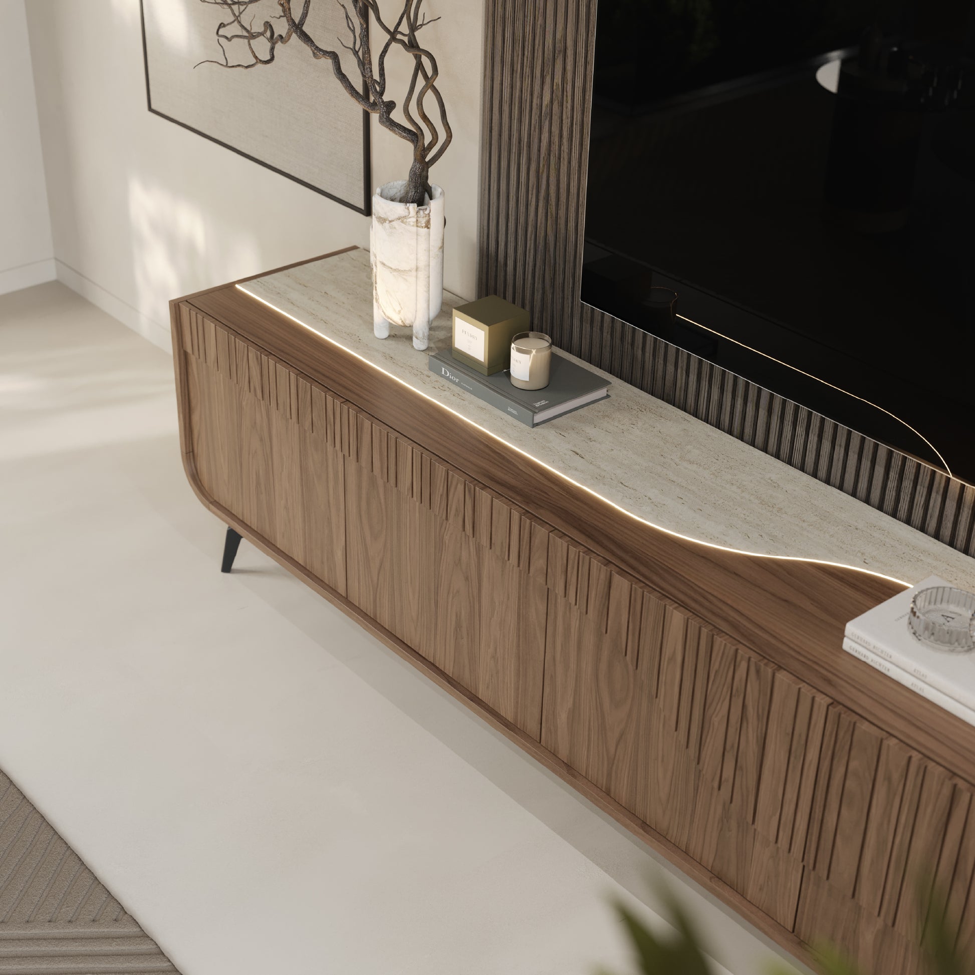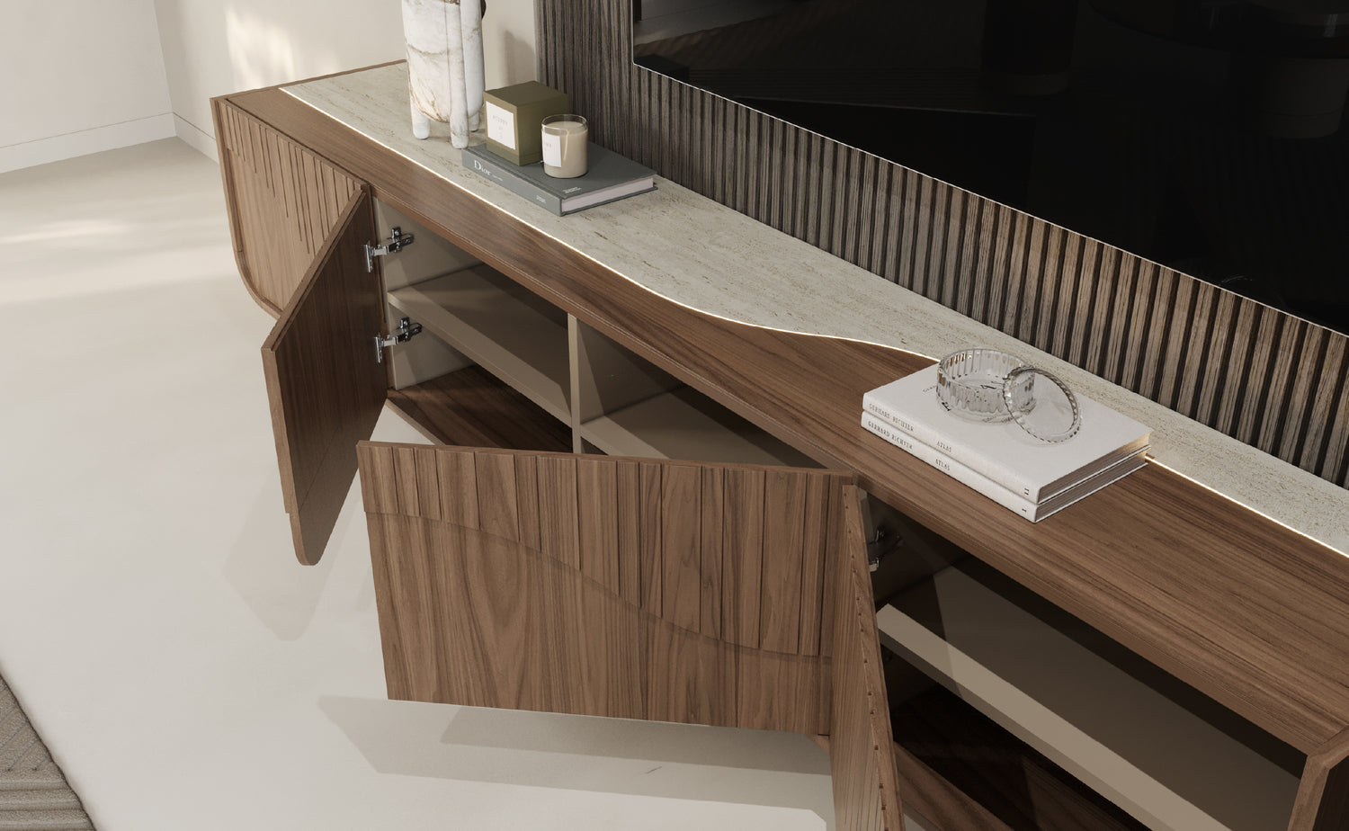 Com quatro portas, a base TV disponibiliza espaço amplo para organizar equipamentos multimédia, têxteis ou acessórios, garantindo um ambiente sempre estruturado. Uma solução que alia utilidade e design refinado.
