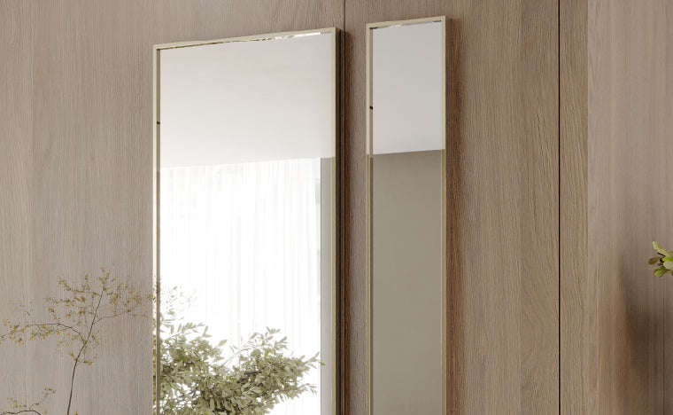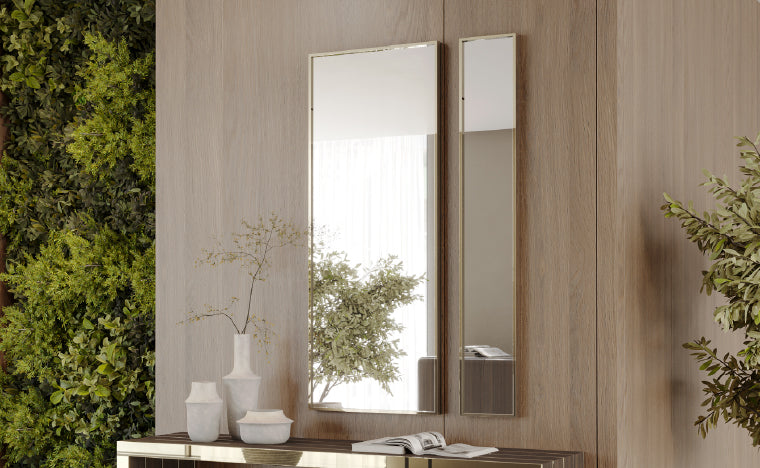 O Espelho Retangular apresenta uma moldura em metal fino com acabamento dourado, que acrescenta um toque de requinte ao hall de entrada. Uma peça que combina subtileza e durabilidade, valorizando a verticalidade do espaço sem sobrecarregar a decoração.