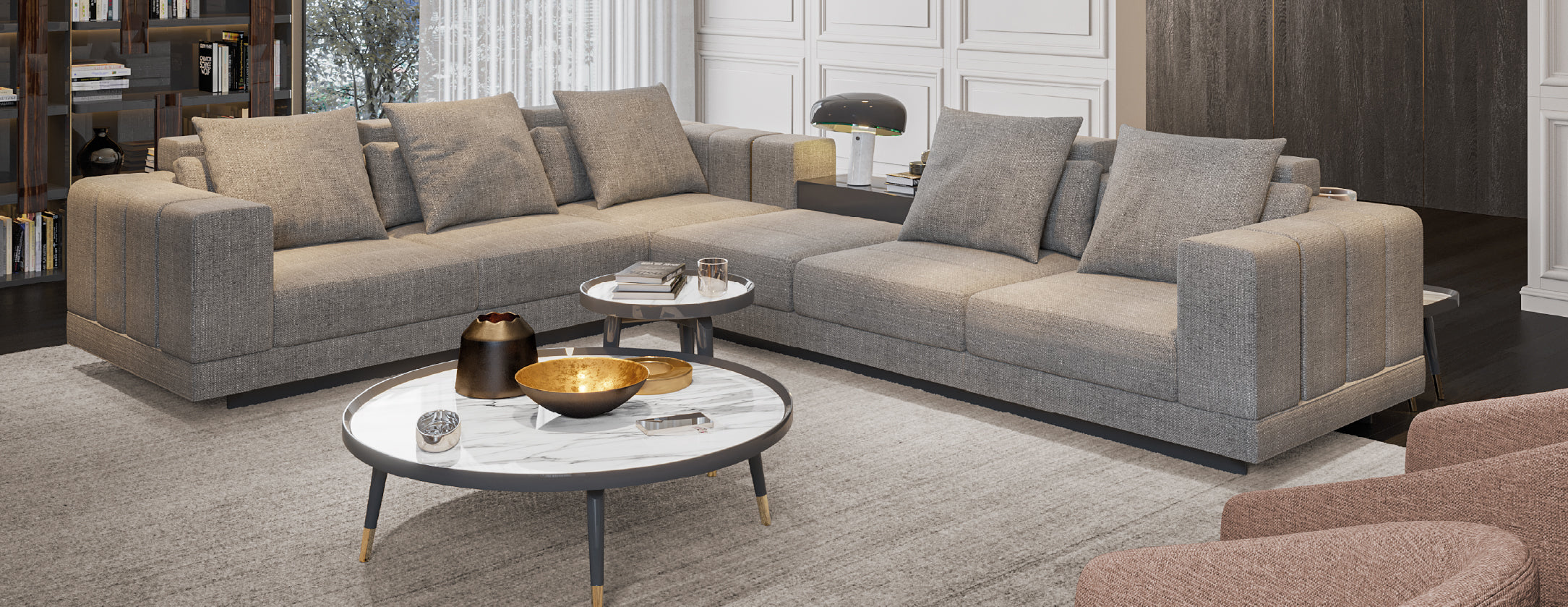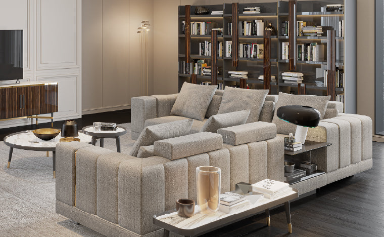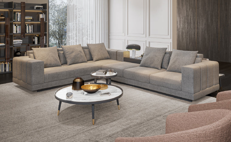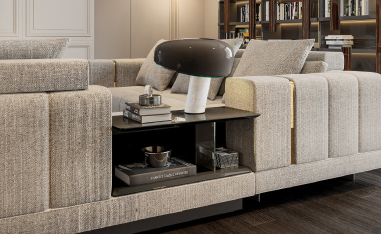 Com módulos que incluem prateleiras incorporadas, o Sofá Vercelli alia conforto e utilidade. A estrutura oferece superfícies de apoio discretas e acessíveis, perfeitas para livros, iluminação ou objetos de uso diário.