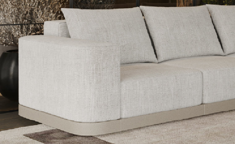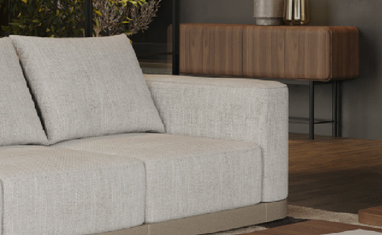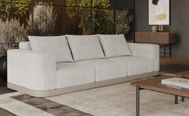 A base em tecido contrastante percorre todo o perímetro inferior do sofá, reforçando a sua estrutura e criando uma ligação subtil com os restantes elementos do ambiente. Um detalhe que destaca a linha e a intenção do desenho.