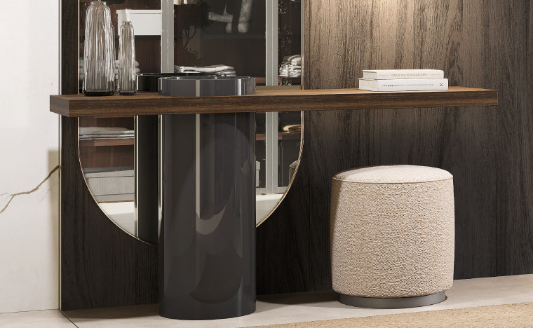 The formal lightness of the console contrasts with its structural solidity. The well-proportioned top serves as a support for everyday objects or decorative elements, while the recessed base conveys a feeling of floating and visual lightness.