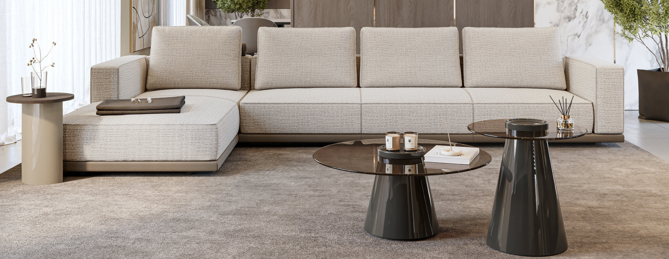 With a round glass top available in clear, grey, or bronze finish, the Vollmer Coffee Table easily adapts to different living room styles. A versatile and timeless piece.