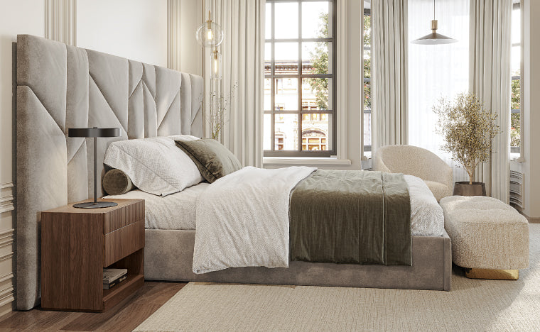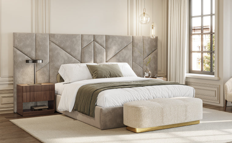 La Vercelli III con base cerrada está indicada para dormitorios principales o suites con una estética contemporánea y refinada. El cabecero estructurado añade textura al entorno, mientras que la base cerrada transmite estabilidad y organización visual.