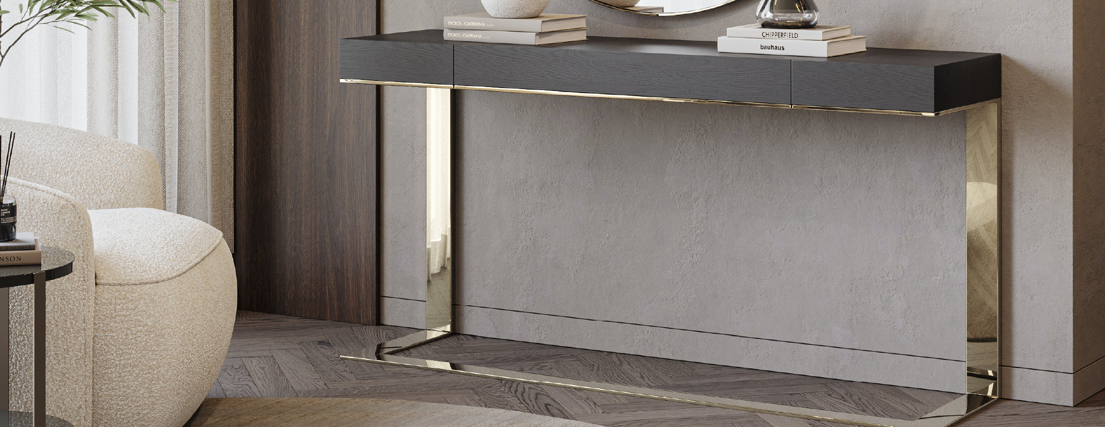 A Consola Trace combina a sofisticação do dourado polido com a sobriedade da madeira escura, criando um ponto de destaque no hall de entrada. O contraste entre os materiais eleva o ambiente, tornando esta consola num elemento decorativo e funcional de presença marcante.