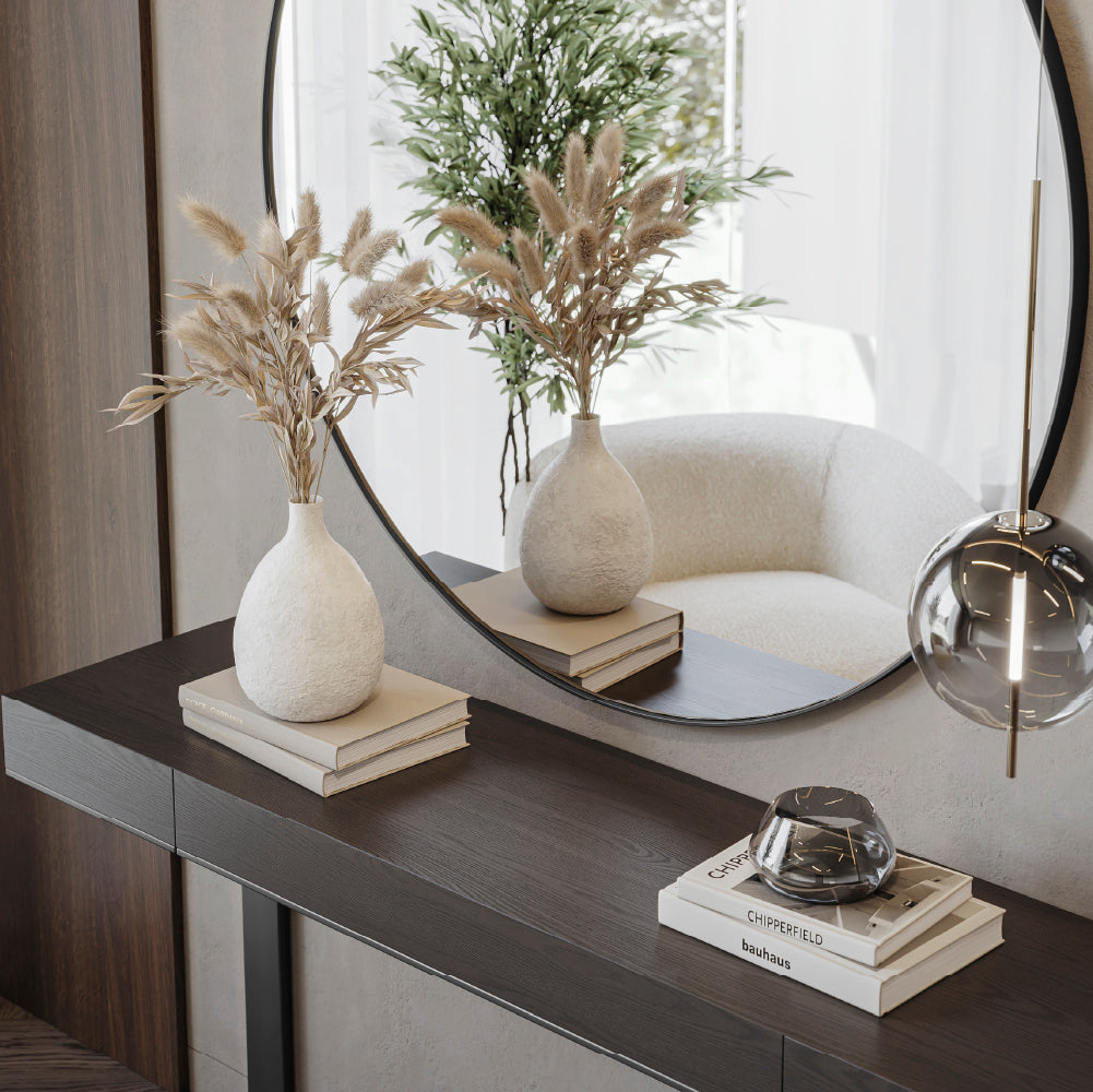 Com tampo em madeira texturada, a Consola Trace oferece espaço amplo para composições com livros, jarras ou esculturas. Um convite subtil para valorizar o hall de entrada com peças cuidadosamente selecionadas, mantendo sempre a identidade Evanyrouse.