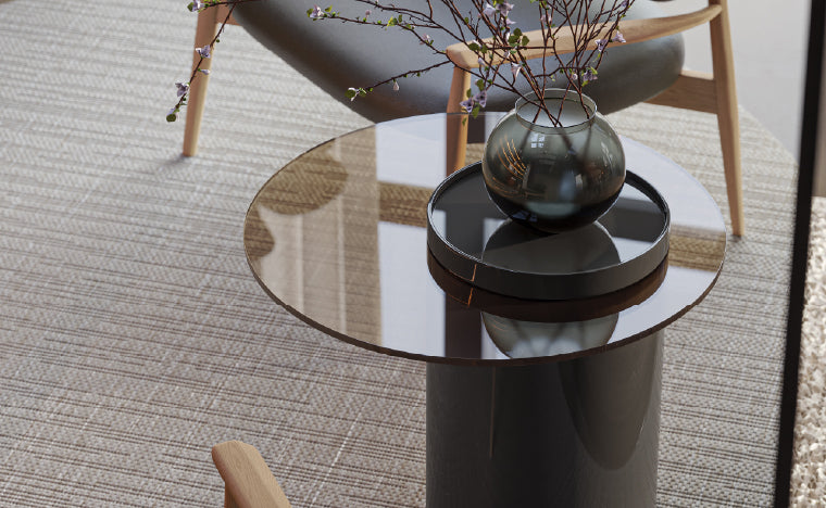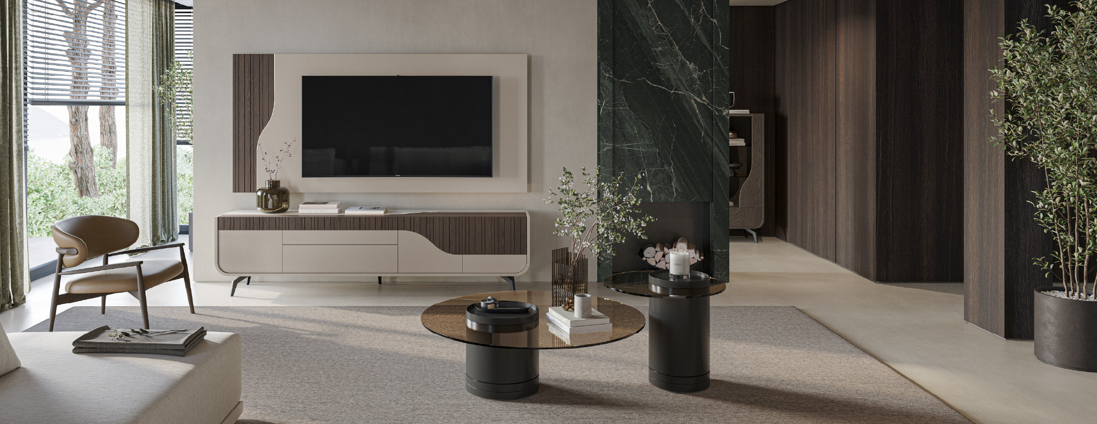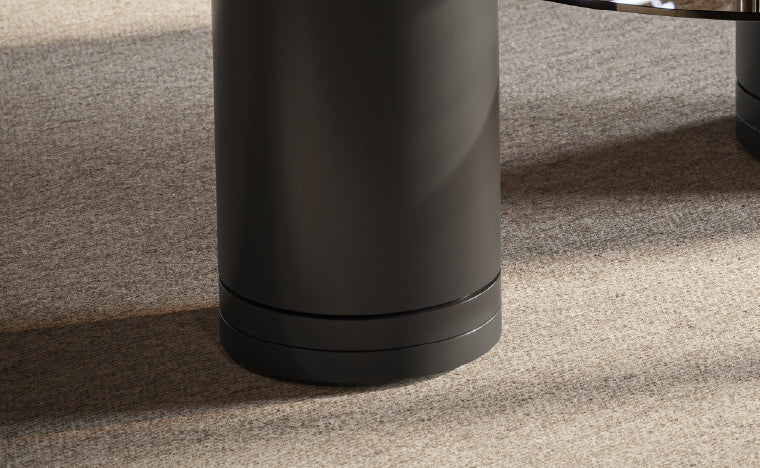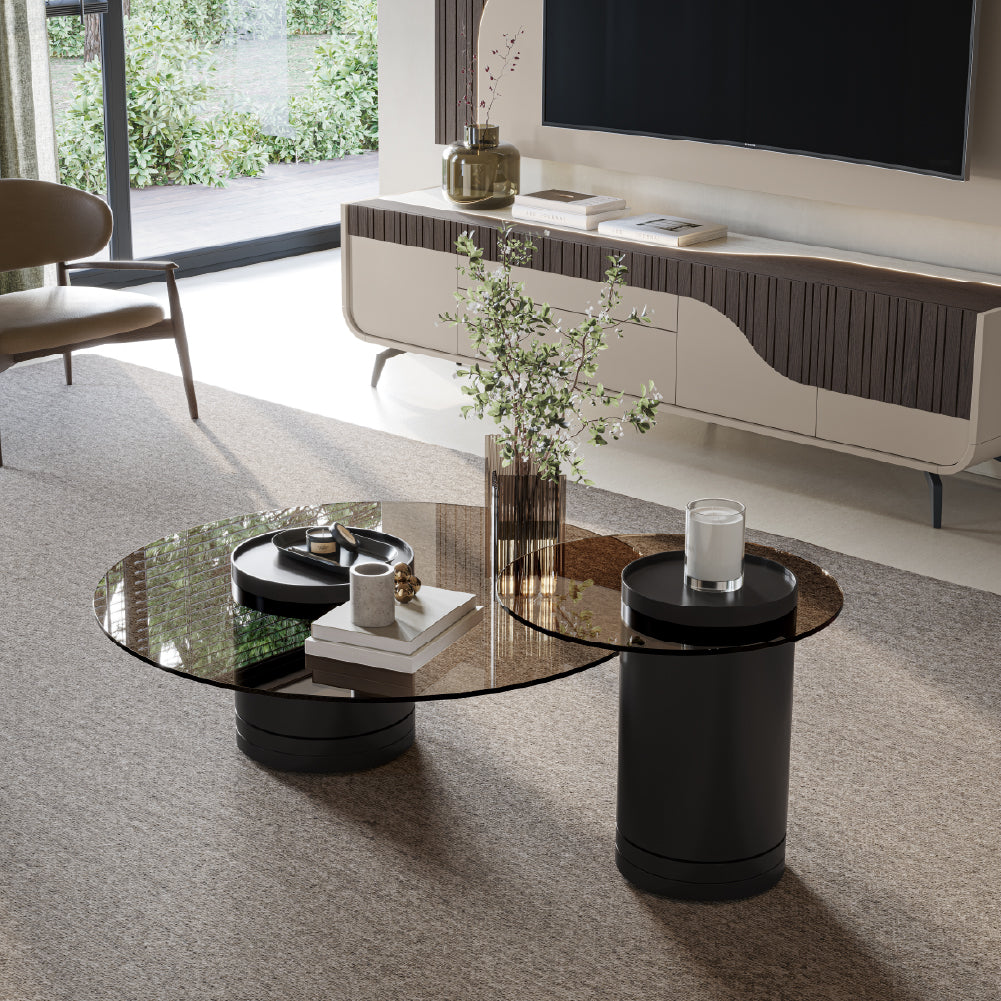 Disponível com tampo em vidro bronze, gris ou incolor, a mesa adapta-se a diferentes estilos de interiores, conferindo luminosidade e leveza ao espaço. A variedade de acabamentos permite criar composições personalizadas e exclusivas.