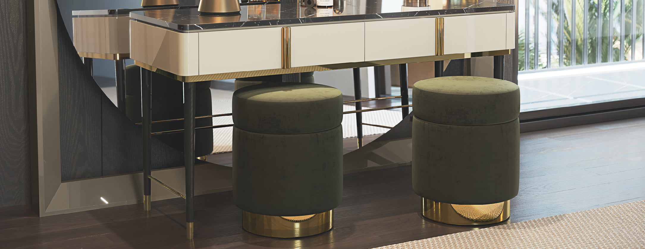 A base metálica em dourado confere carácter ao Puff Ledy e cria um subtil jogo de reflexos sobre o pavimento. Uma presença discreta mas marcante, que valoriza a zona de estar com um apontamento luminoso e sofisticado.