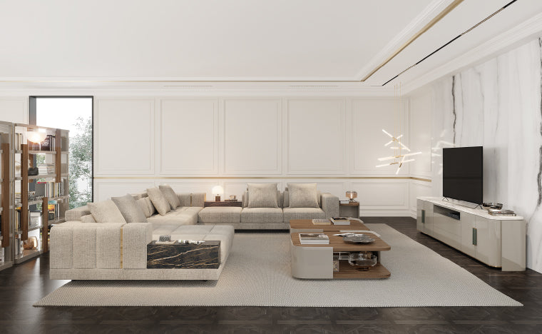 O detalhe em pedra natural acrescenta um ponto focal sofisticado ao Sofá Vercelli. A combinação entre textura têxtil e superfície mineral reforça a identidade contemporânea e singular da peça.